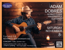 Adam Dobres, World Class fingerstyle guitarist @Char's, Port Alberni Saturday November 8th 2025 doors 6:30pm start 7:30pm